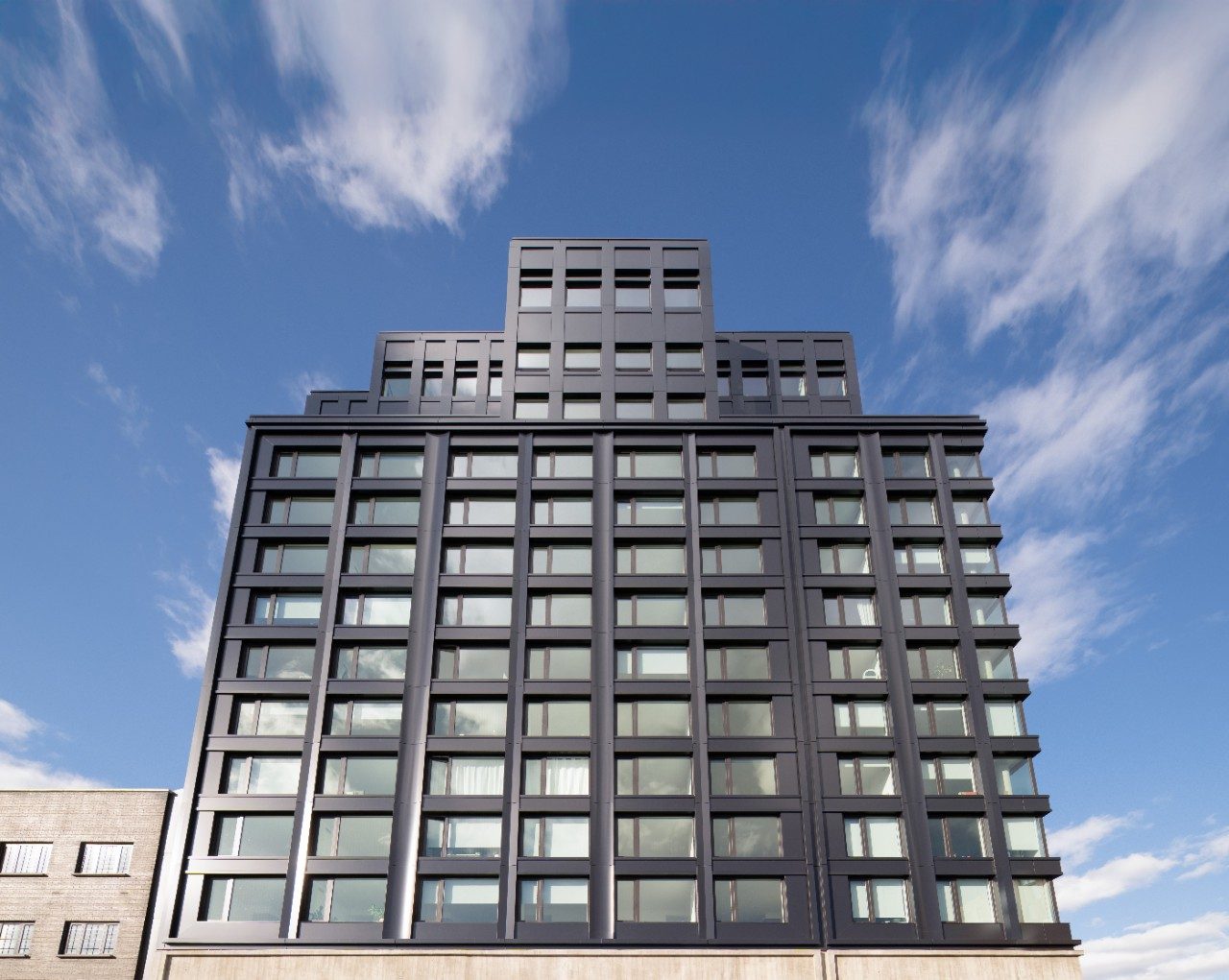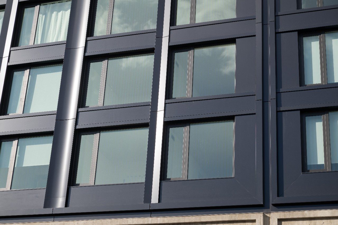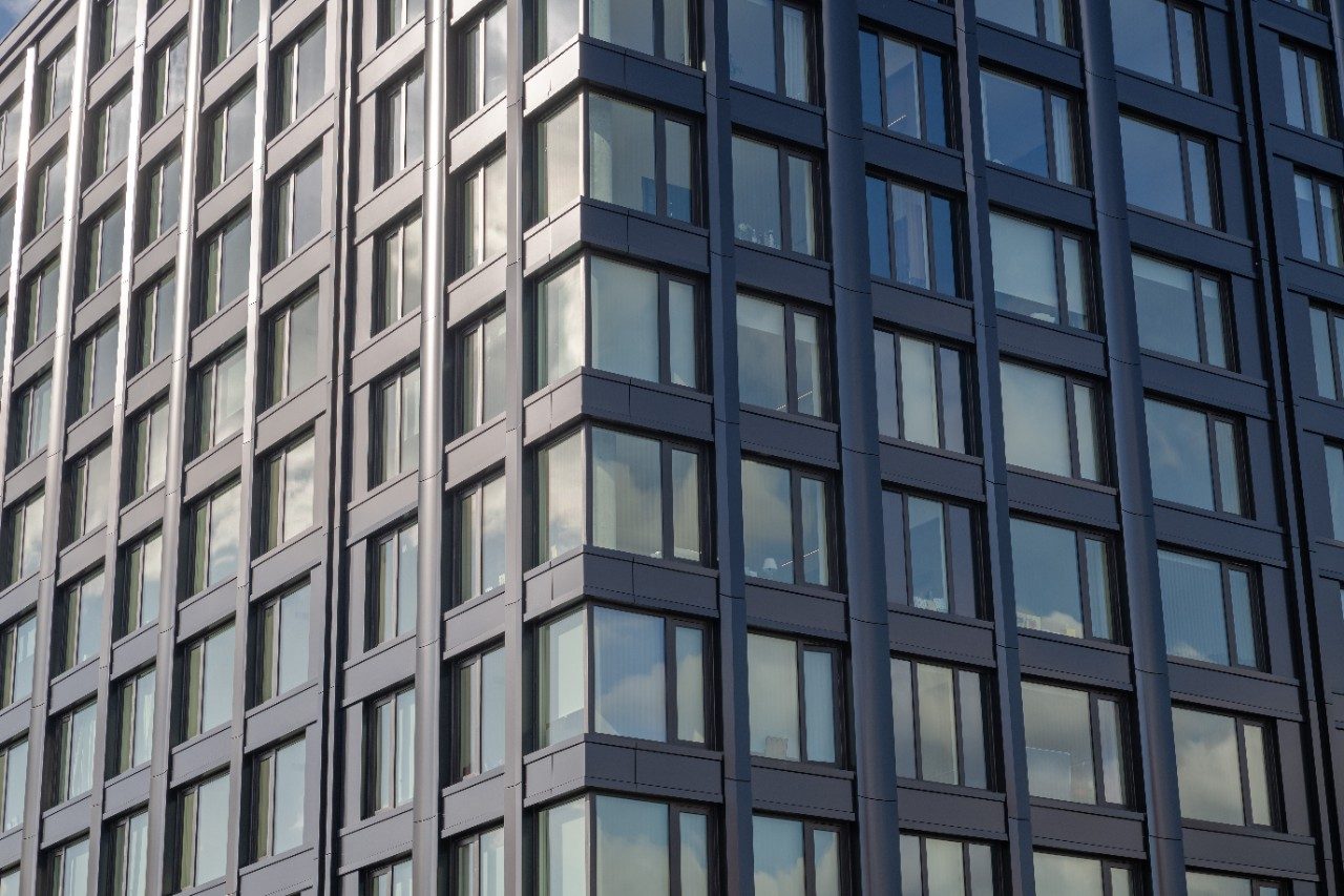 Vibrant blue glass enhances the design of the building