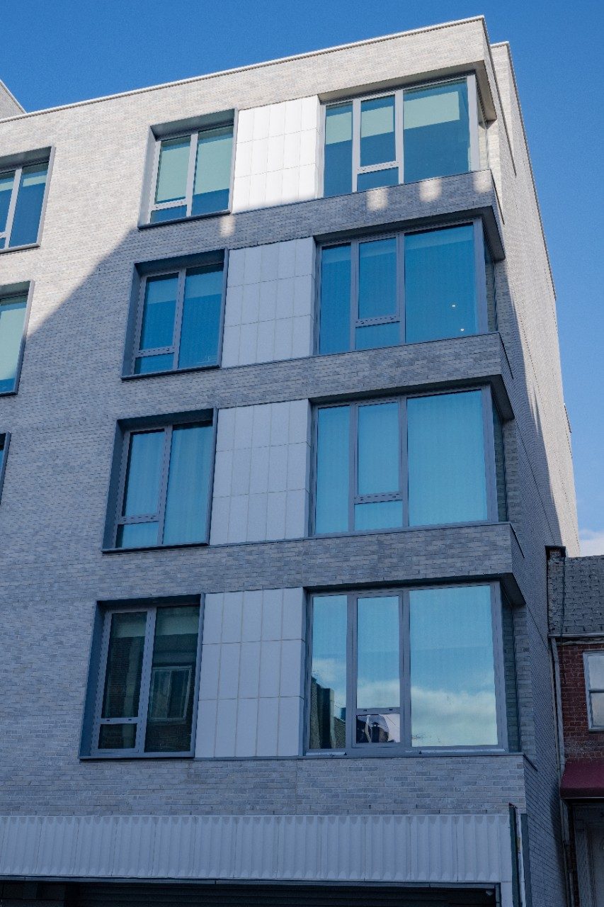 Vibrant blue glass enhances the design of the building