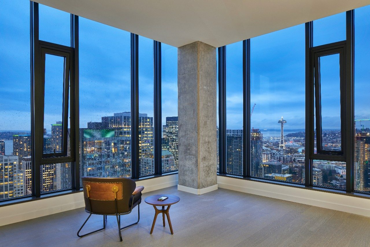 The AMLI Arc Residential Tower is a 41-story residential tower wrapped in Guardian SunGuard® AG 43 on clear and SuperNeutral® 68 on low-iron glass , designed by ZGF featuring extensive daylighting and a commanding view of Seattle.