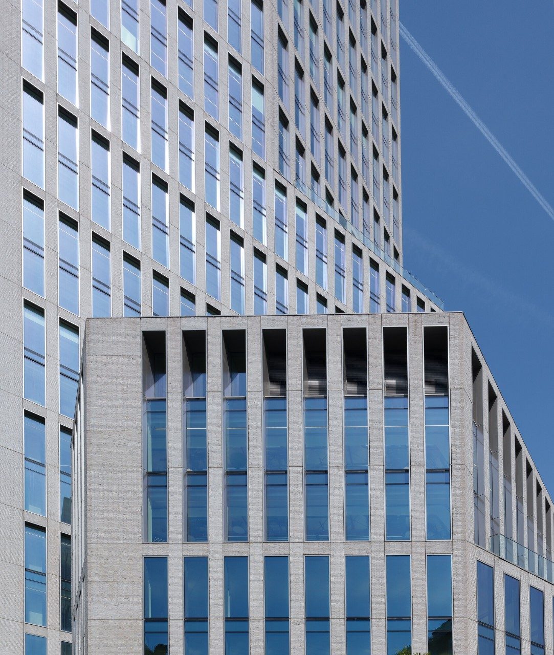 Our glass products have been instrumental in shaping the HYLO Tower's distinctive design. Located in the lively borough of Islington, the tower's glass façades harmoniously integrate with the heritage brick and concrete cladding, showcasing a blend of modern and traditional elements. Our SunGuard® SN 70/35 coated glass, crafted for durability and aesthetic quality helped enhance the building's appearance. The light-filled interiors created by our glass help foster an inspiring workspace that encourages creativity and connection among occupants with the vibrant London cityscape. The Finsbury Tower – HYLO Building project has proudly received both the WELL Gold and BREEAM Excellent certifications.