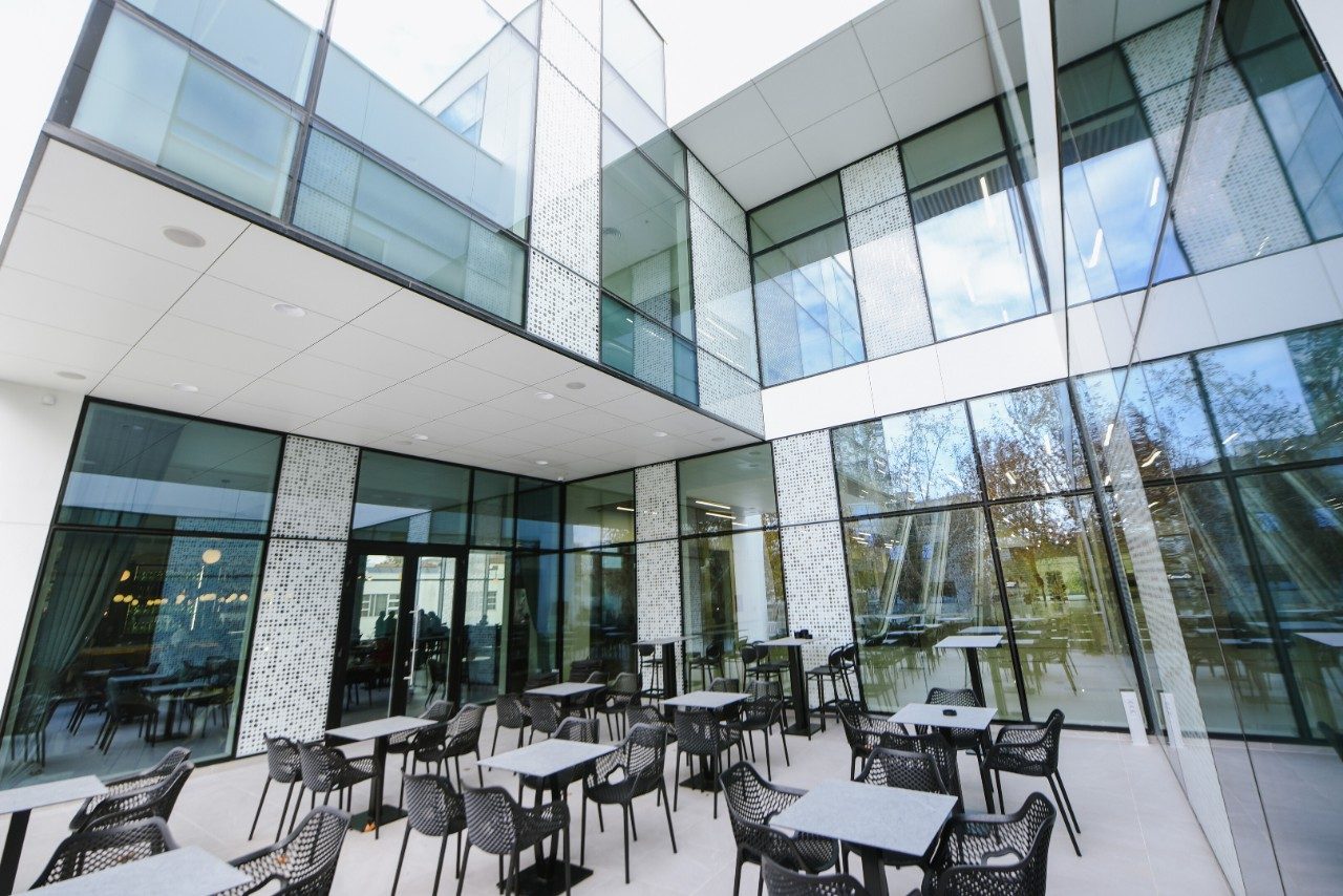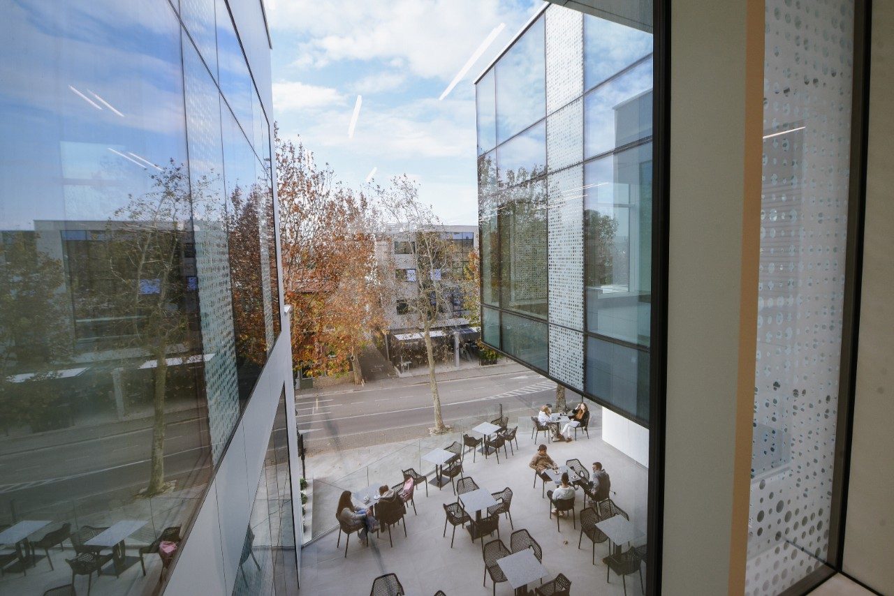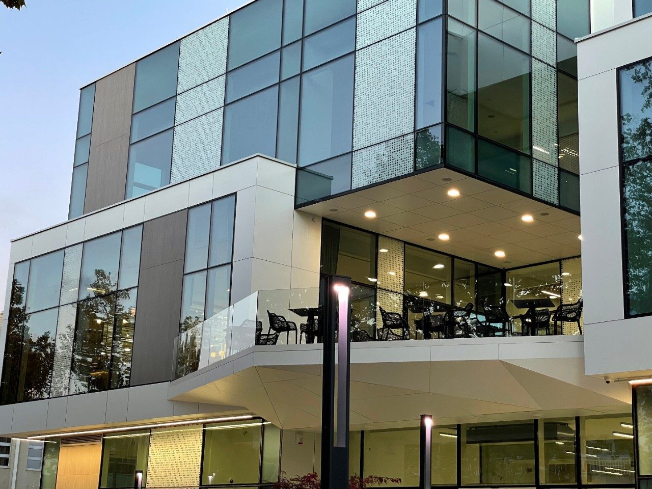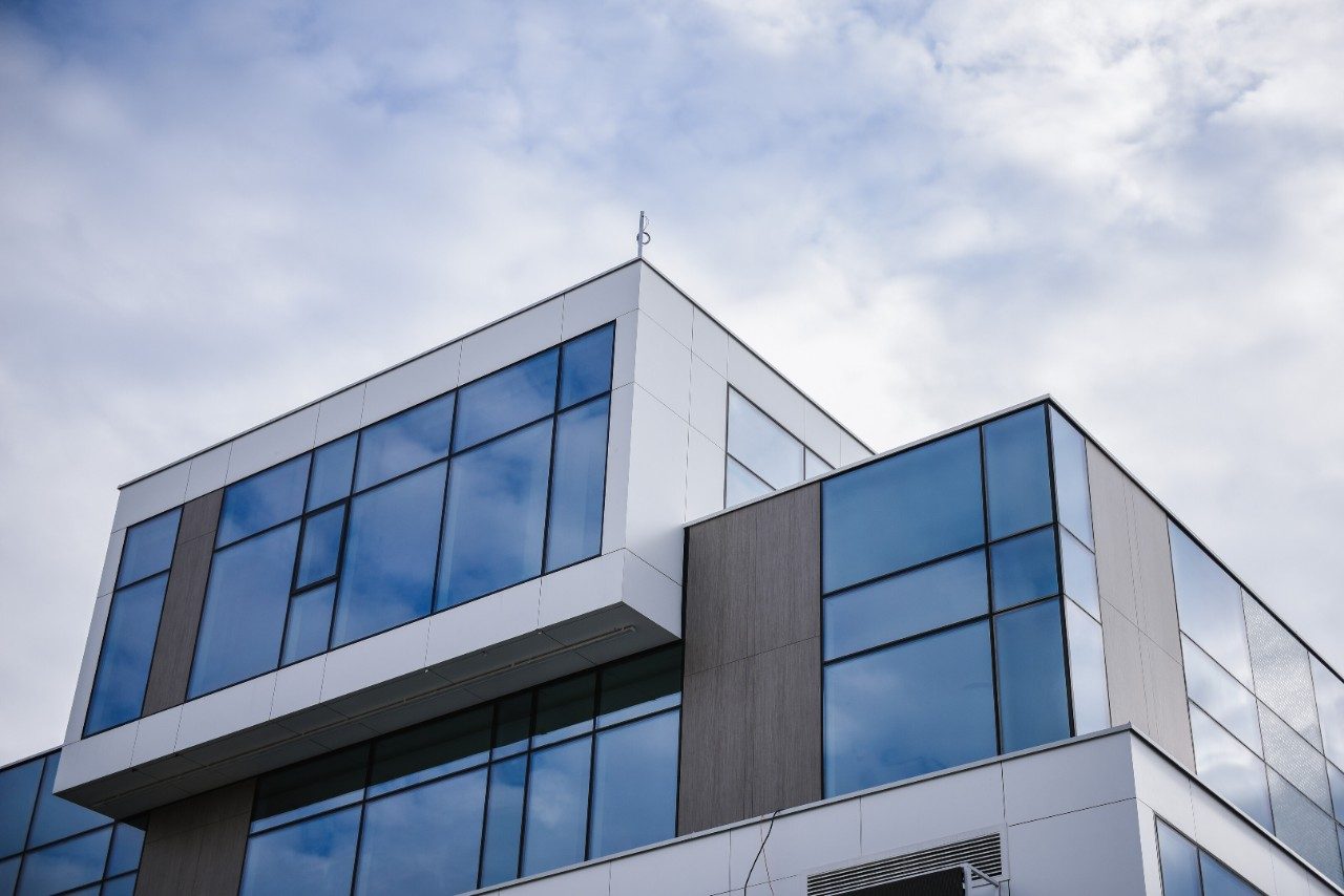 Vibrant blue glass enhances the design of the building