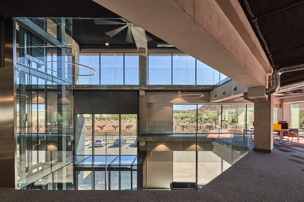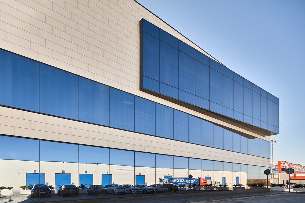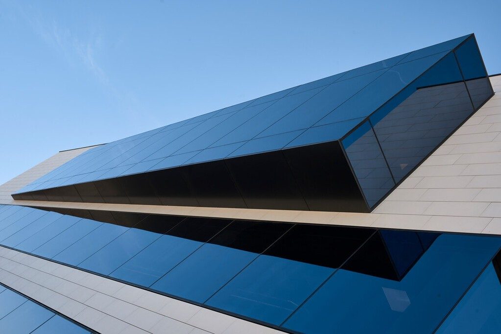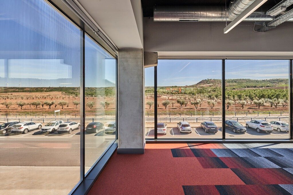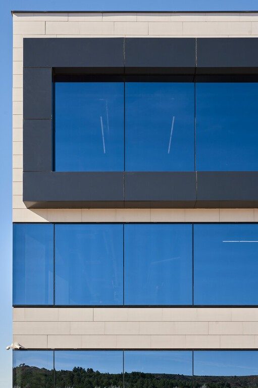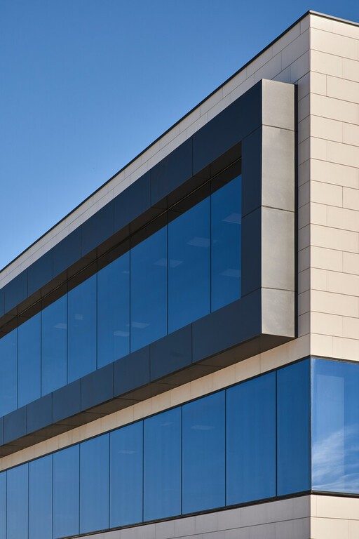 The headquarters of Grupo Arnedo in La Rioja, Spain, is an attractive-looking office. Guardian SunGuard™ High Performance (HP) Royal Blue 41/29 coated solar control glass was chosen for the building’s visually striking glazed facade. HP Royal Blue 41/29 was chosen due to its deep sky-blue reflection and high color rendering index (CRI) of 95. The color rendering index tells how the colors seen through the glass are true, perfectly true colors having a CRI of 100. Providing low solar energy absorption and a solar factor of 29%, HP Royal Blue 41/29 helps minimize solar energy gain, while allowing visible light transmission of 40%.