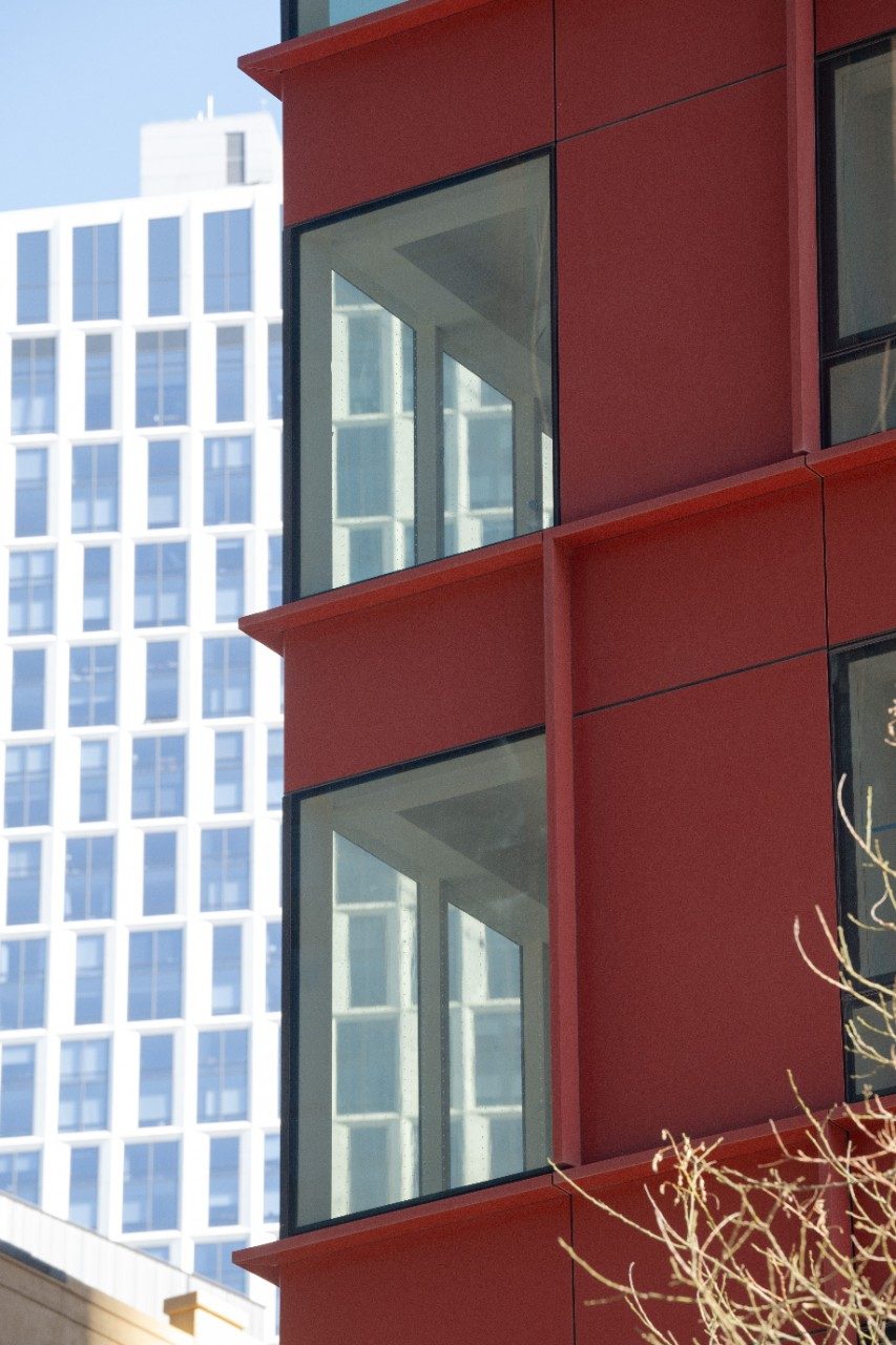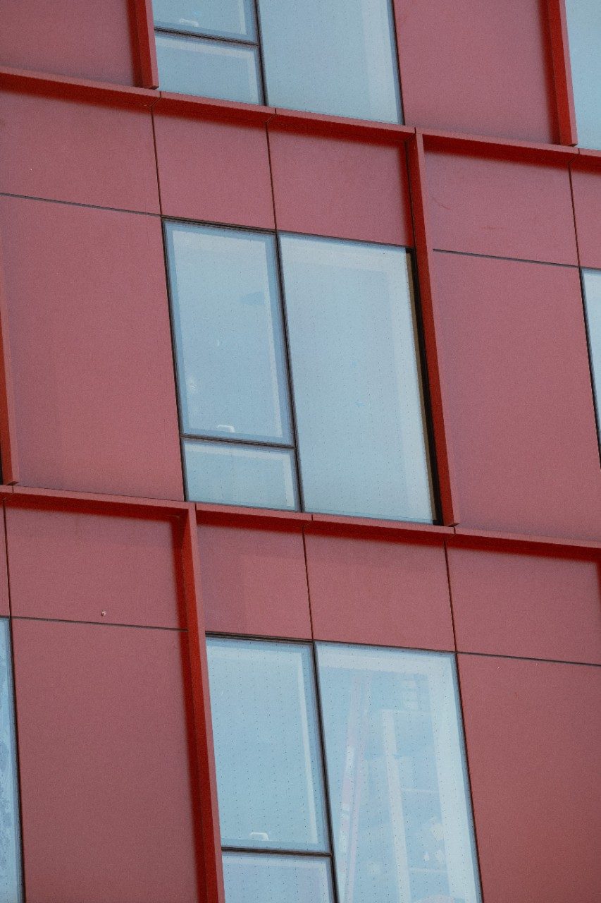 Vibrant blue glass enhances the design of the building