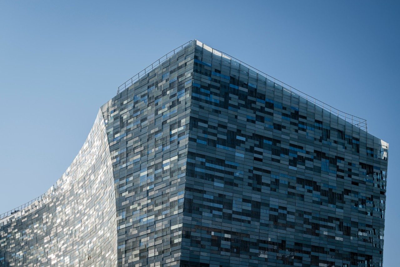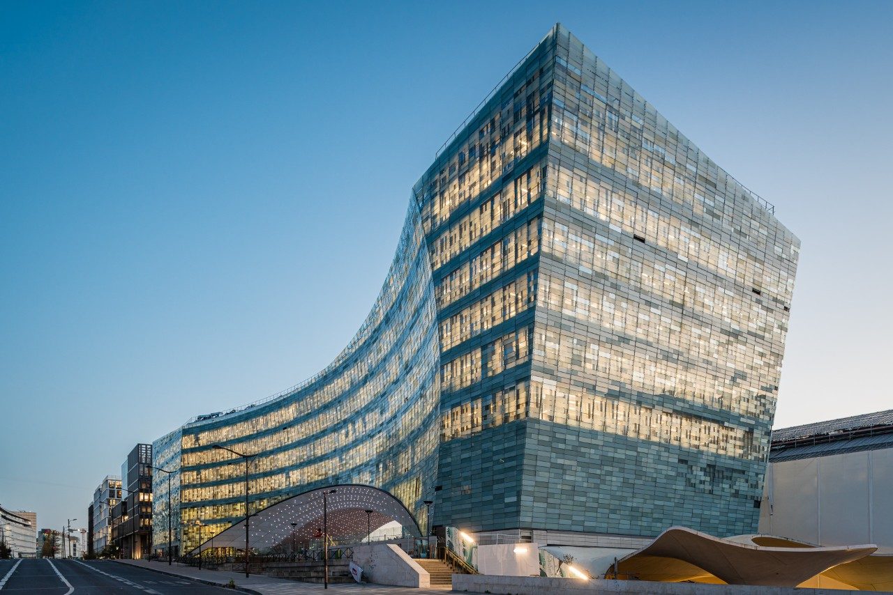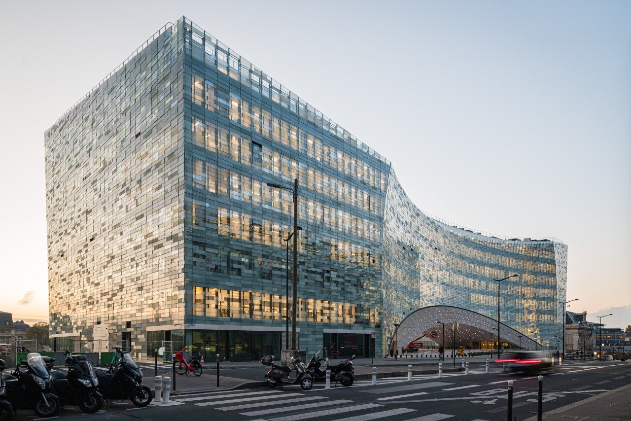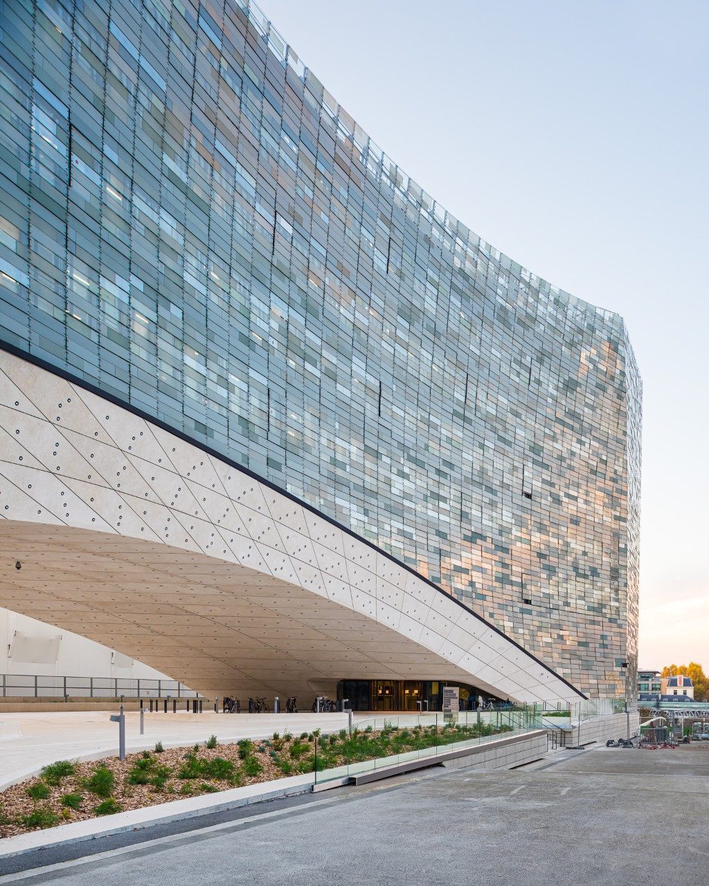 Designed by Snøhetta, Le Monde Group headquarters building in Paris has a dynamic, semi-transparent glazed façade that opens the building to its surroundings. The building’s pixelated outer skin consists of more than 20,000 glass elements in a strictly organized pattern that gives the building an appearance that shifts with the changing weather and light conditions.