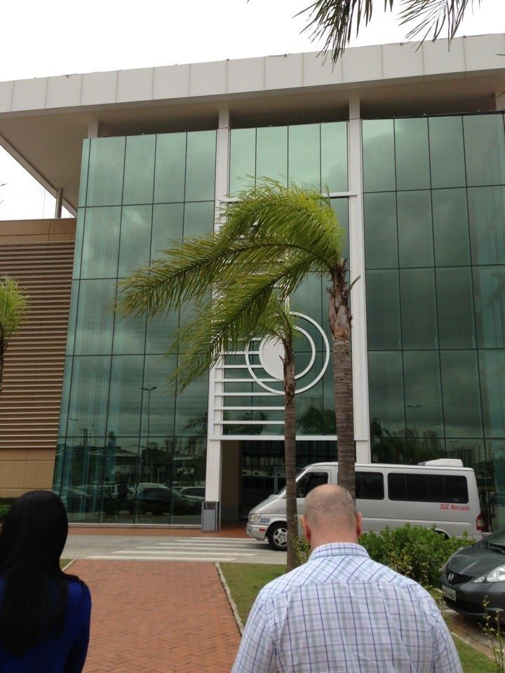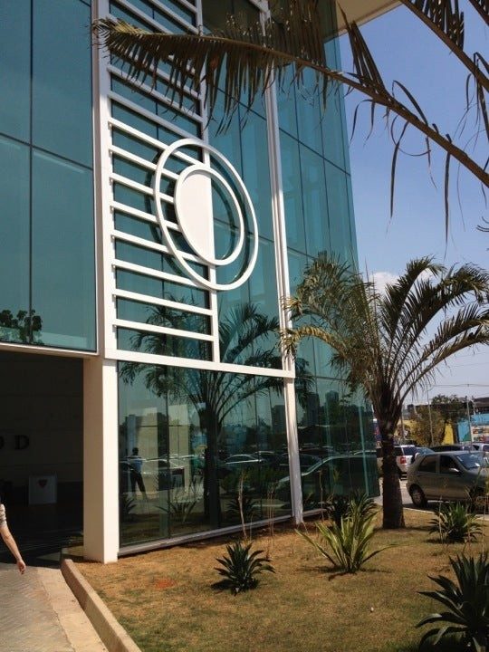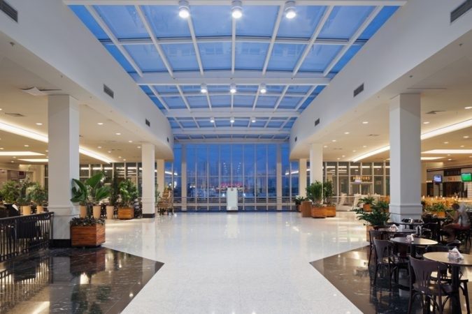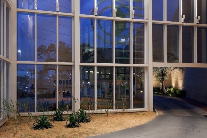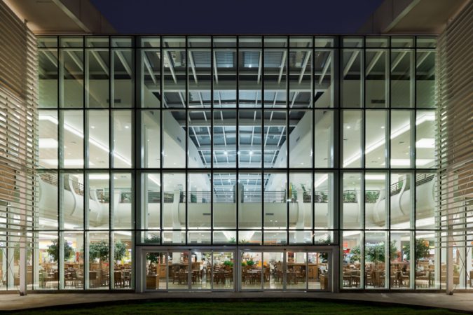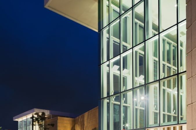 Vibrant blue glass enhances the design of the building