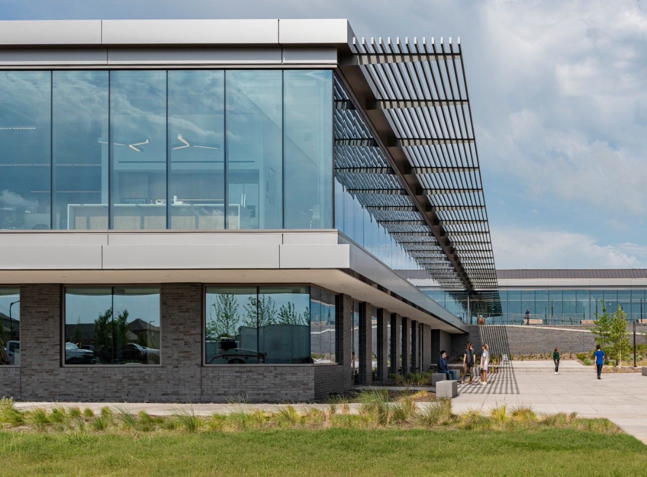 Two stories of floor to ceiling glass featuring SunGuard ® SNE 50/25 are gently reflective, bright and open inviting views of a scenic pond and grounds that include an outdoor plaza, lighted trails, pedestrian bridges and other attractions. The low E performance of the glass helps conserve public dollars by keeping energy costs low.