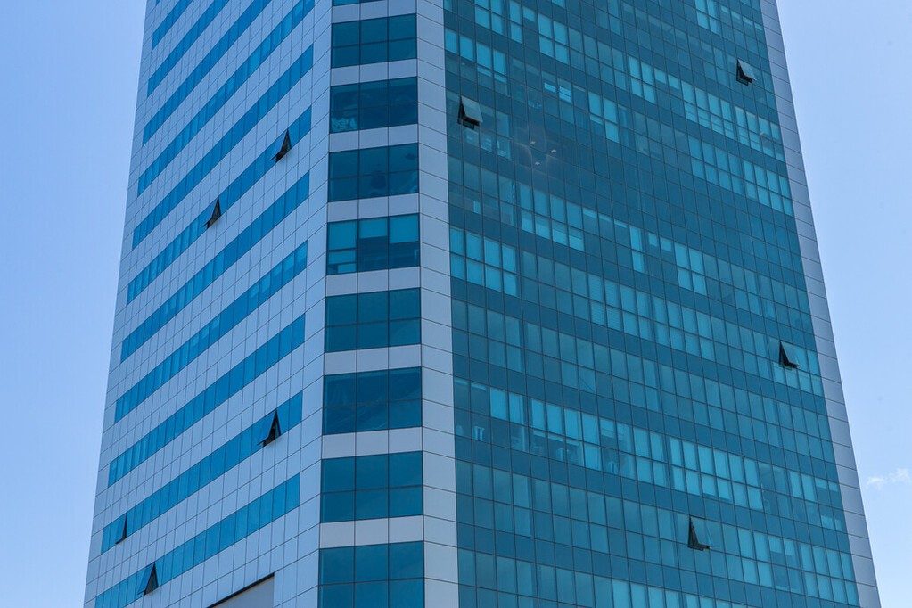 Vibrant blue glass enhances the design of the building