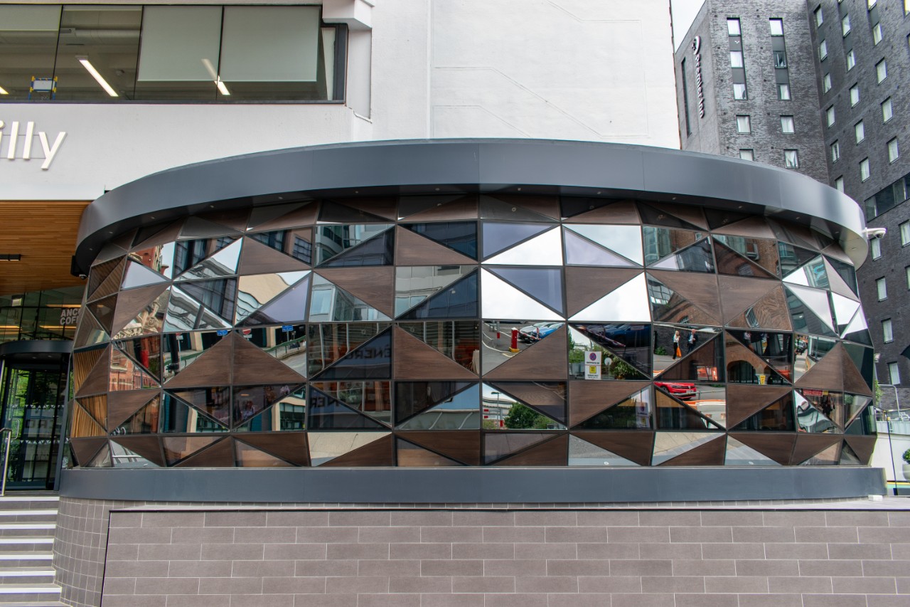 The faceted glass structure of The Gem acts as a reflective surface and uses a combination of glass, stainless steel and oak veneer, which encourages an abundance of natural light into the interior spaces.