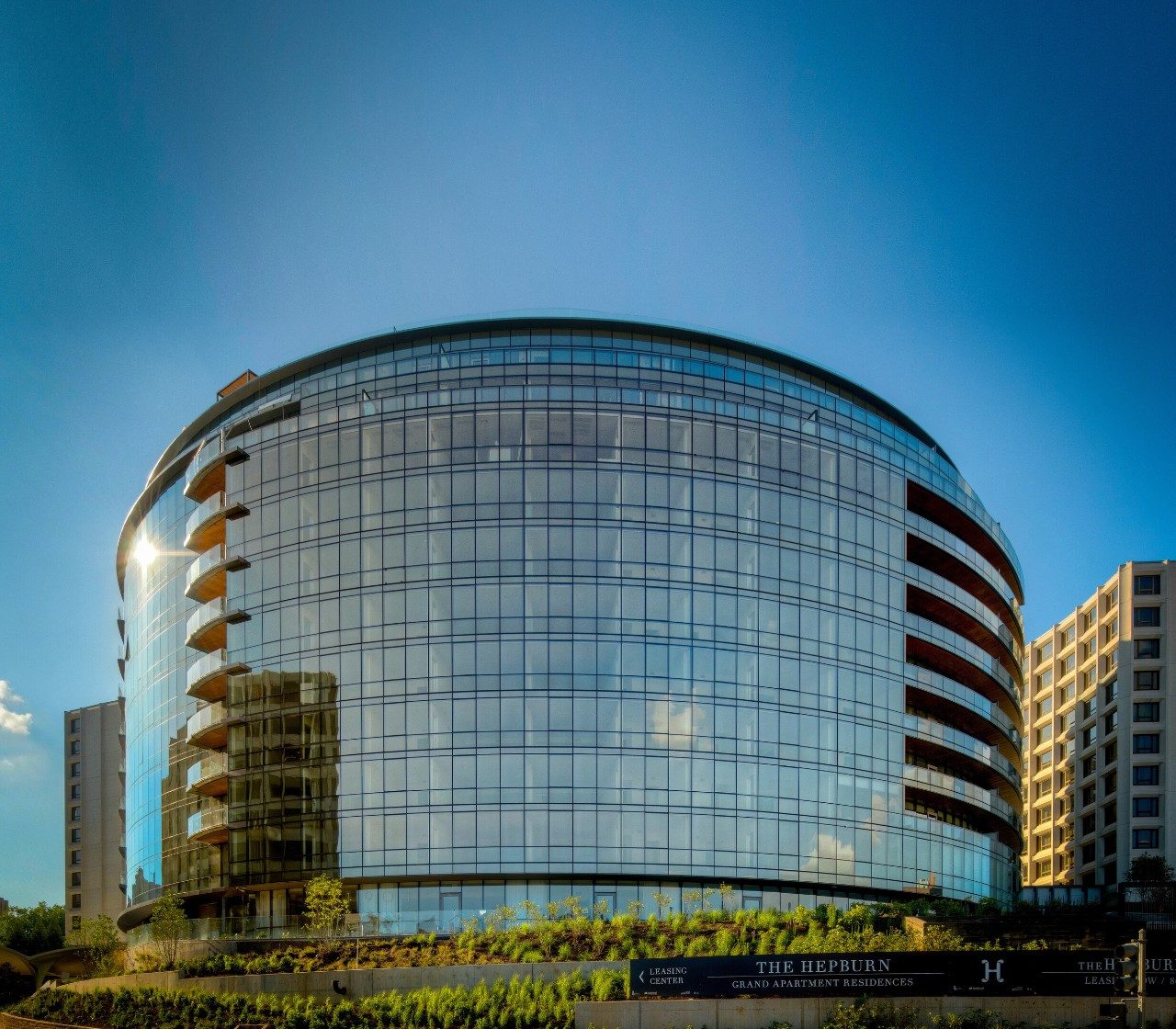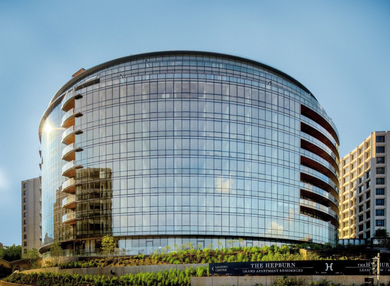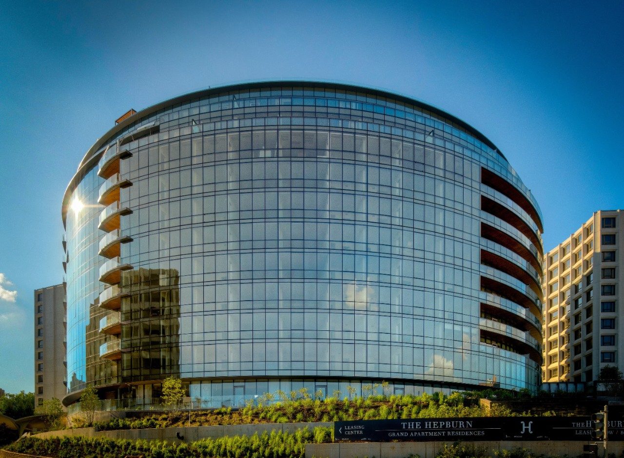 Located adjacent to the iconic Washington Hilton near Dupont Circle, The Hepburn residential building is a harmonious dance between modernity and historic reverence. Drawing inspiration from the hotel’s distinctive architecture, The Hepburn’s glass façade takes on a semicircular form that echoes the existing structure’s signature double arc. The neutral aesthetic of SunGuard™ SN 68 and SN 54 on clear glass contrasts with the concrete gridwork of the hotel, complementing the original architect’s art form while respecting historic context. The result is more than a residential space – it’s a carefully crafted addition that pays homage to a mid-century modern landmark while offering panoramic city views.