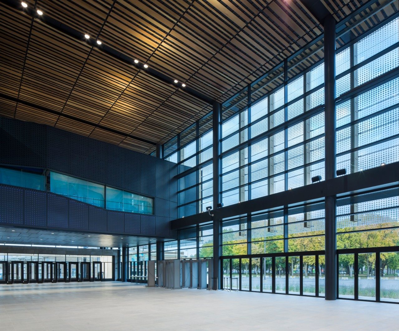 Vibrant blue glass enhances the design of the building